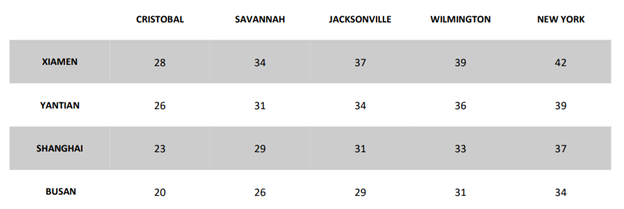 厦门-盐田-上海-釜山-巴拿马运河-克里斯托瓦尔-萨瓦纳-杰克逊维尔-威尔明顿-纽约-苏伊士运河